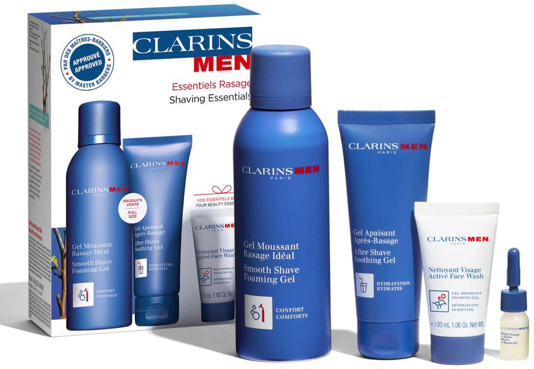 Pensé pour les hommes qui veulent une peau impeccable sans y passer des heures, le Coffret ClarinsMen Essentiels Rasage condense trois miniatures haute performance dans une trousse compacte. Grâce au ClarinsMen Complex — association dynamisante d’herbe à bison, de galanga et de pourpier — chaque formule apaise, renforce et protège la peau face aux agressions du rasage quotidien.
